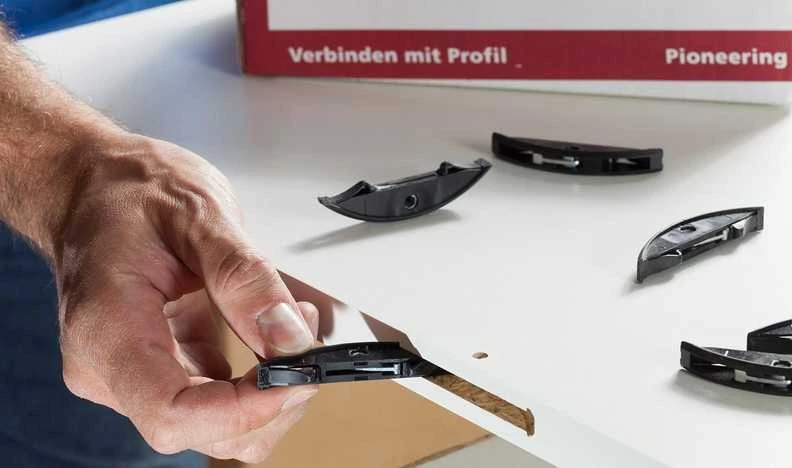 - Les goupilles de positionnement s’intègrent parfaitement dans la contre-pièce, de sorte que même les éléments avec un angle de 90° peuvent être montés facilement.