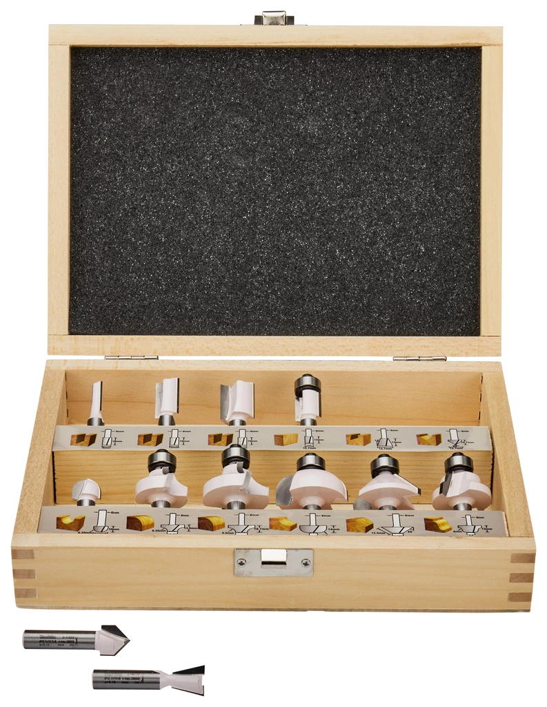 - Jeu de 12 fraises comprenant : 3x fraises à rainurer, 1x fraise à copier, 1x fraise à queue d’aronde, 1x fraise à rainurer en V, 1x fraise à profil creux, 2x fraise à bordure avec roulement, 1x fraise à profil creux avec roulement à billes, 1x fraise à chanfrein, 1x coupeur de profil de cadre.